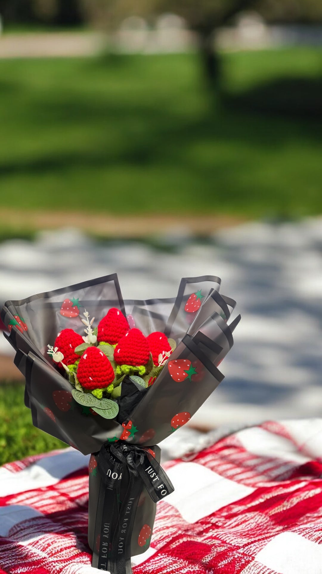 A sweet and cozy crochet strawberry bouquet featuring 6 hand-crafted strawberries, thoughtfully wrapped and made to last forever. This charming bouquet is the perfect gift for Valentine’s Day, anniversaries, birthdays, or just because — a playful yet heartfelt alternative to fresh flowers.
